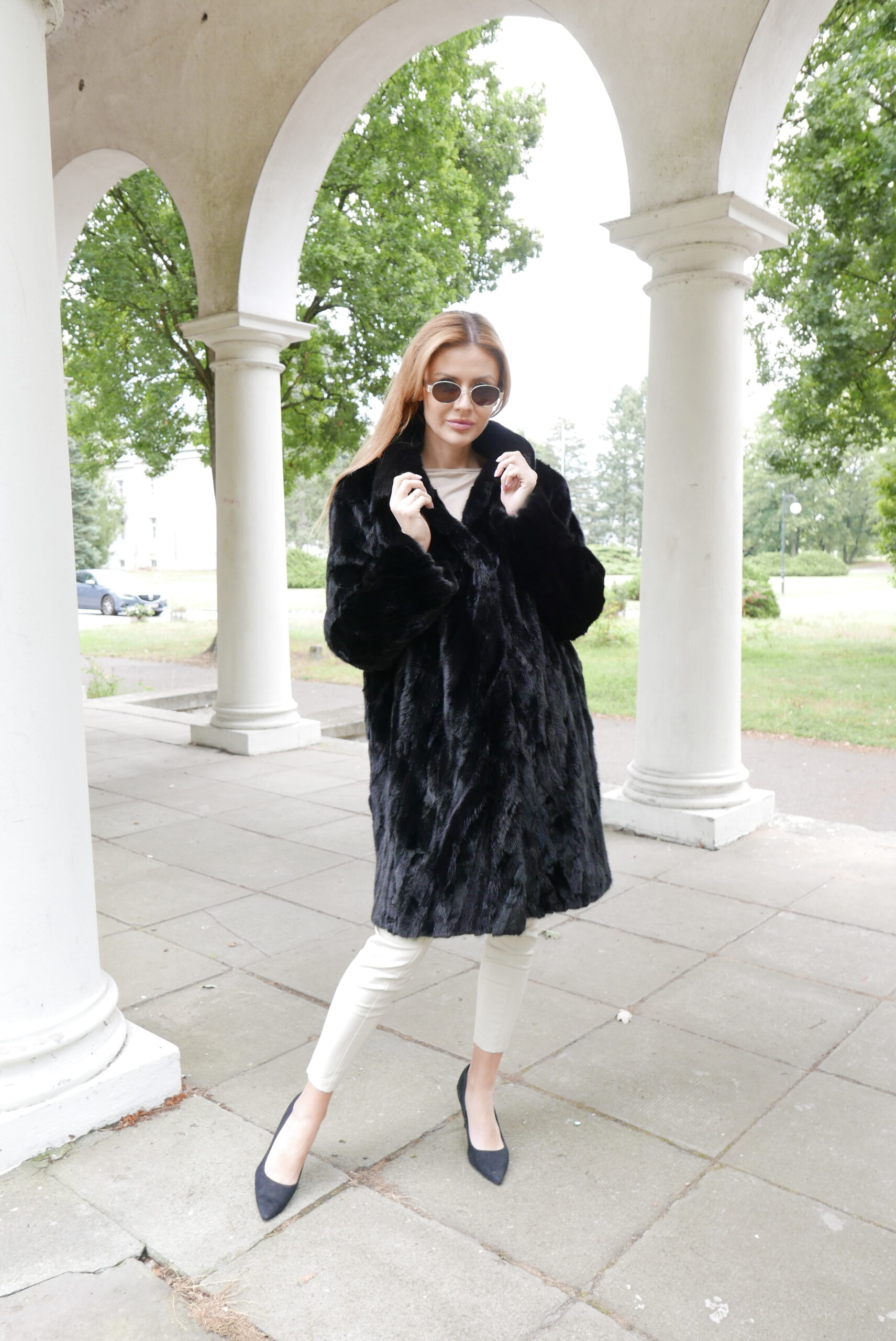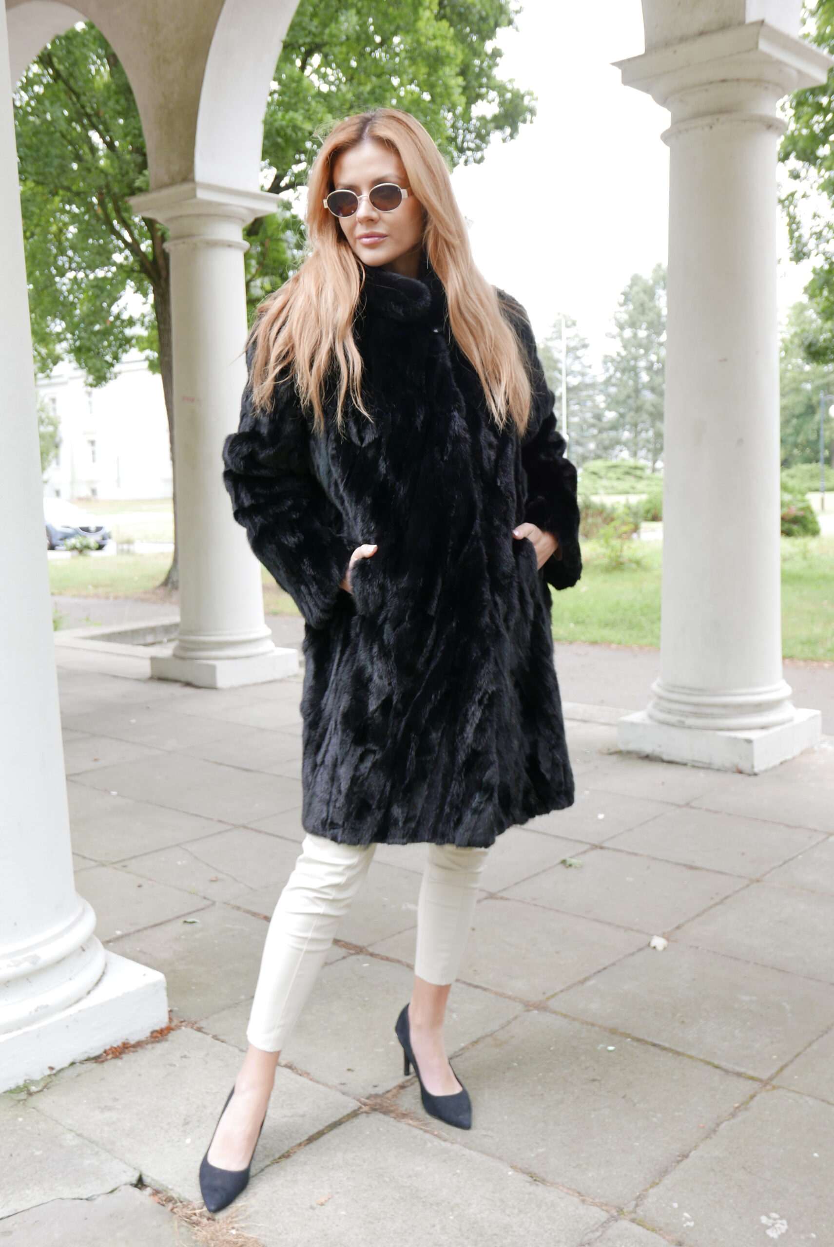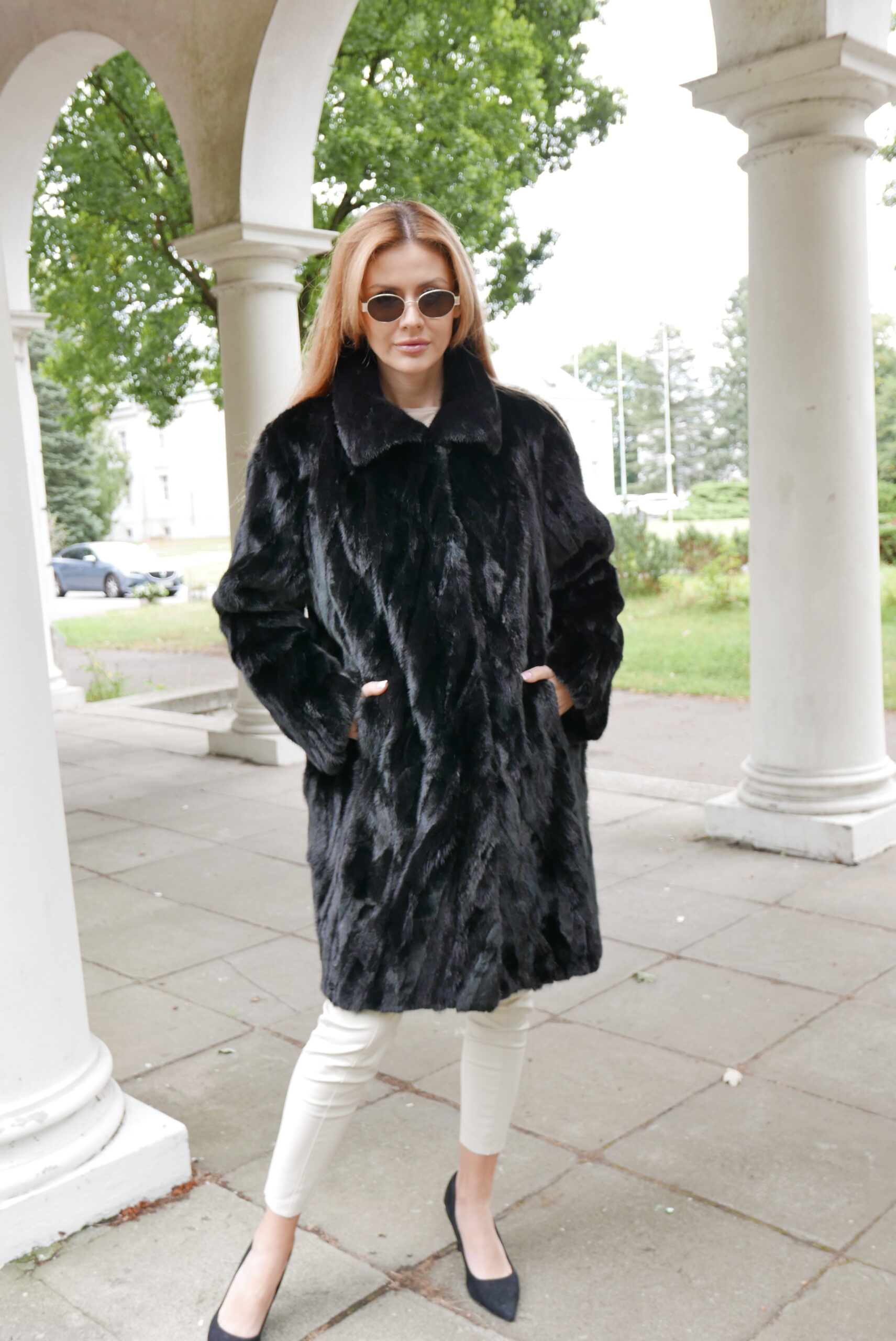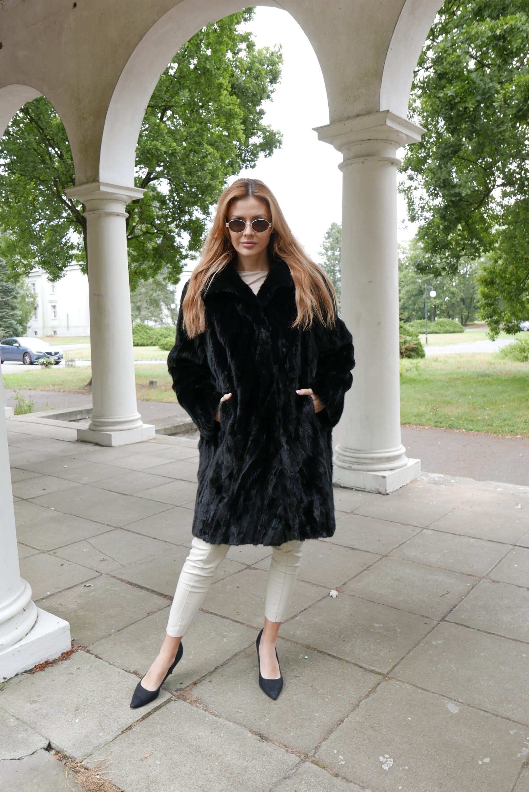 Eleganckie futro wykonane z kawałków naturalnych skór norek w klasycznym, czarnym kolorze. Delikatne w dotyku, a jednocześnie idealne na chłodniejsze dni.