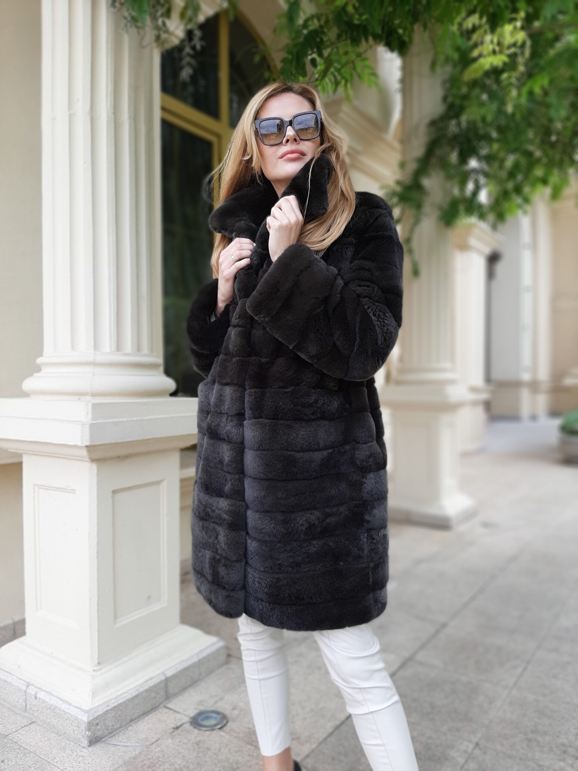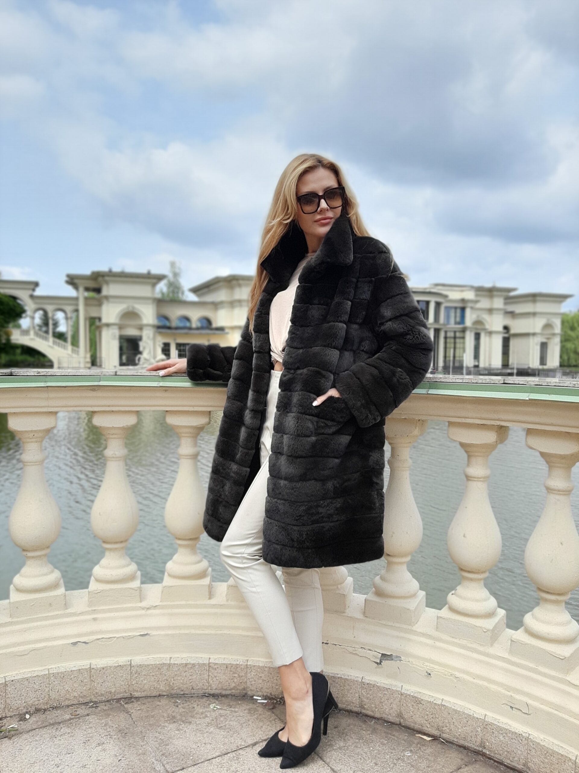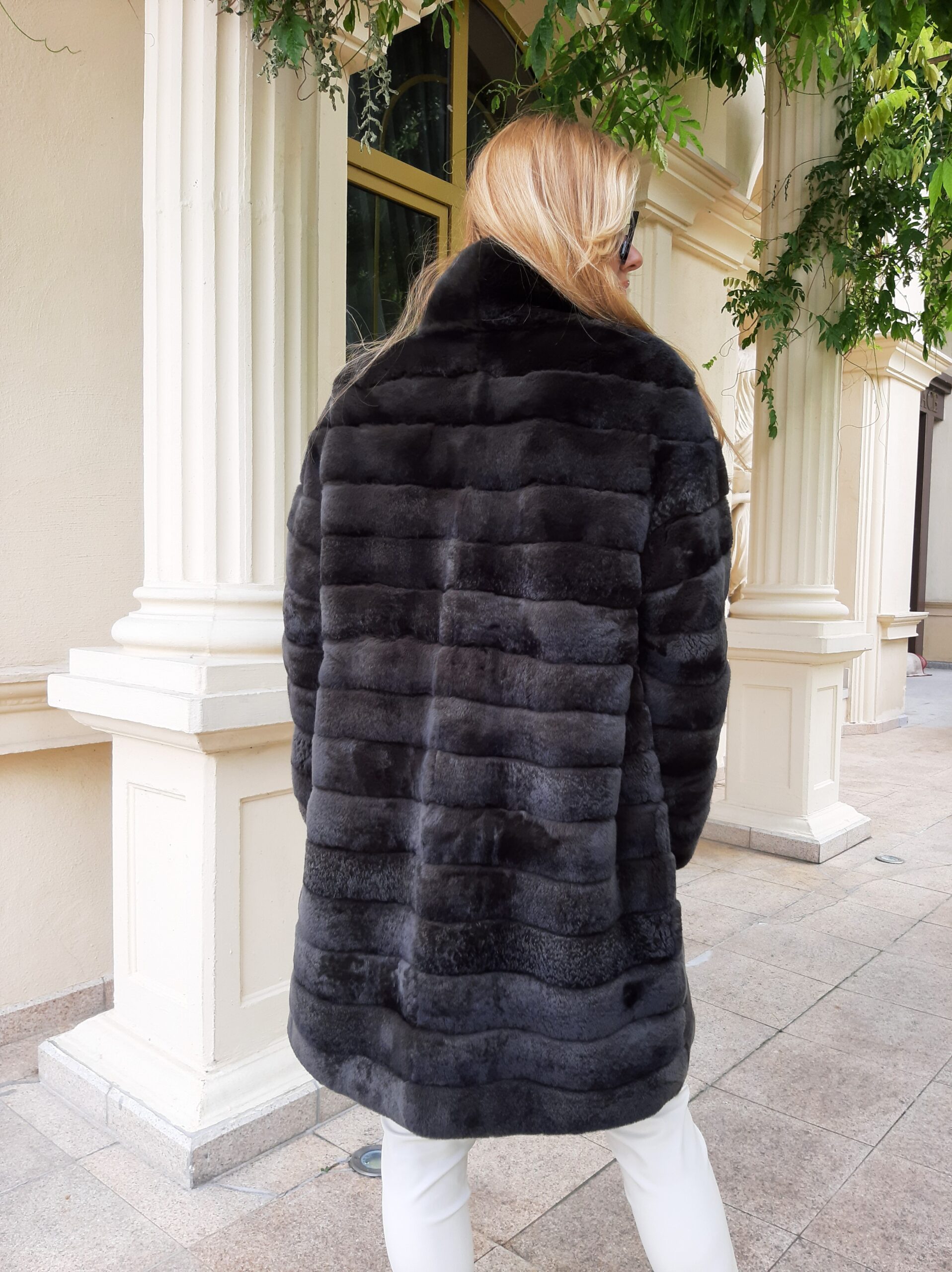 Futro wykonane z najwyższej jakości skór szynszyloreksa z kołnierzem w kolorze Dark Grey, wzór w poziome pasy