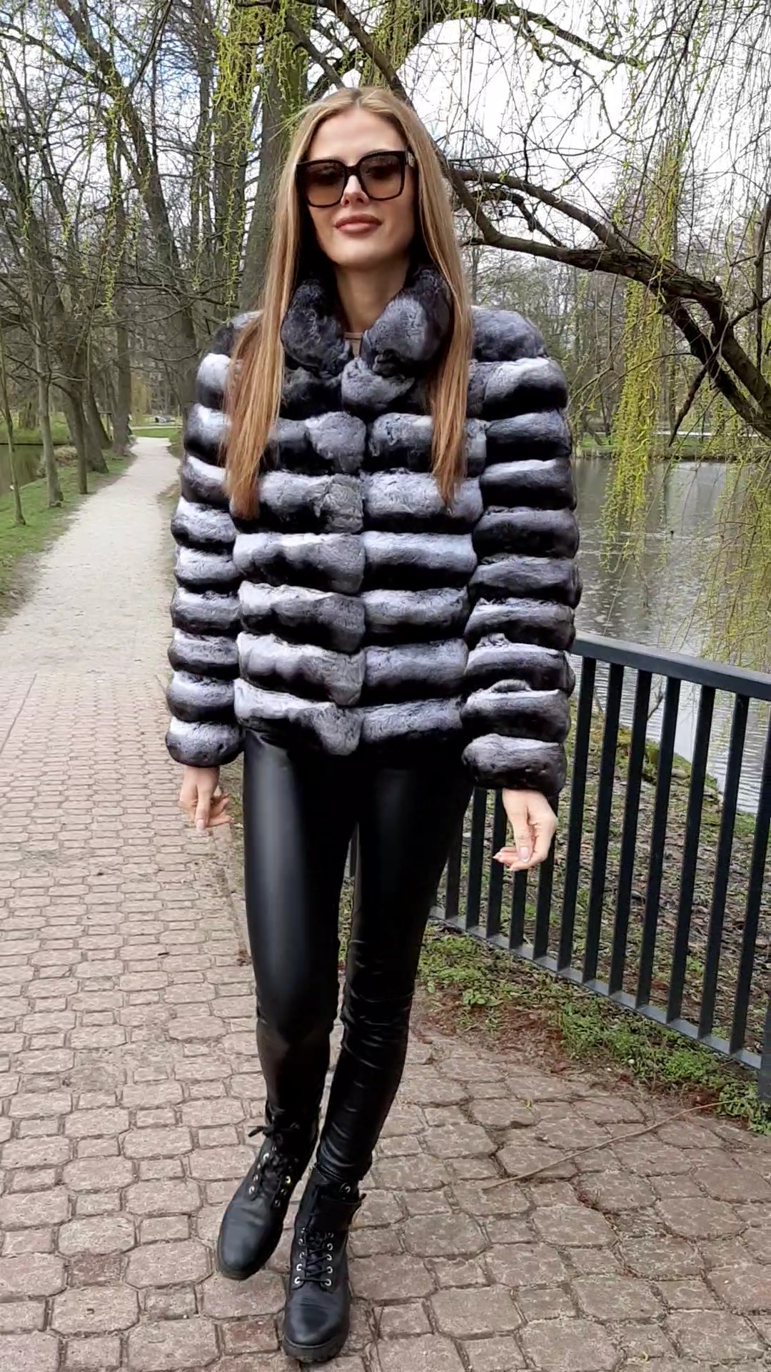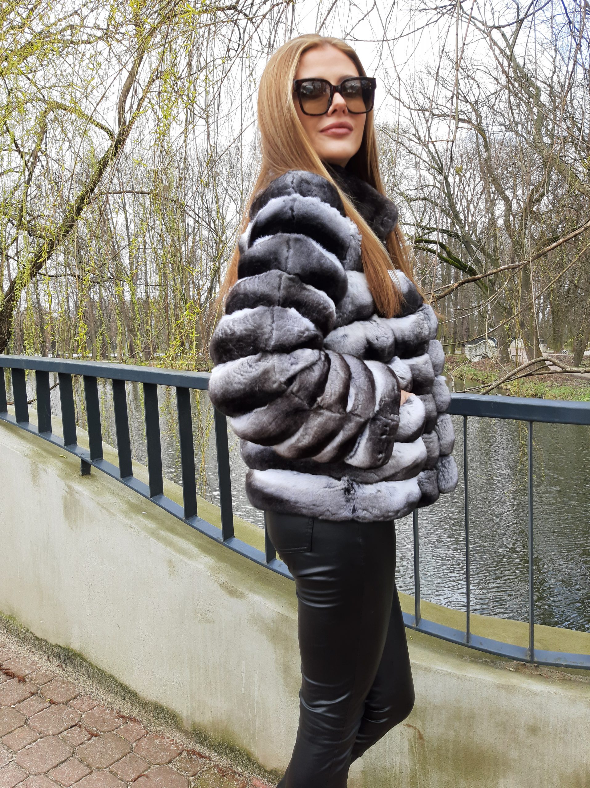 Kurtka z najwyższej jakości skór szynszyli w naturalnym kolorze ze stójką